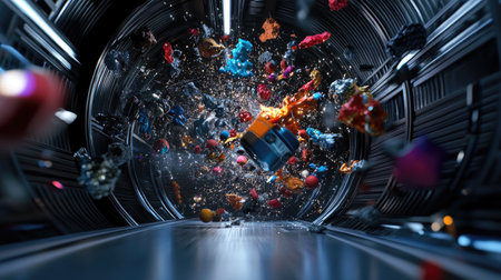 This stunning image showcases a dynamic explosion of colorful objects within a futuristic sci-fi tunnel, reflecting energy and vibrant motion.