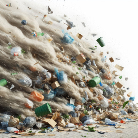 A striking visualization of waste materials bursting from a green trash can against a vivid green backdrop, emphasizing recycling and sustainability themes.