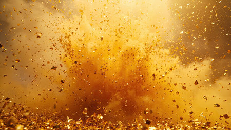 Create a dazzling atmosphere with this vibrant abstract background of an exploding cloud of golden confetti. Perfect for celebrations and festive events, this design features a gold glitter texture with dynamic movement and stunning bokeh. Ideal for party invitations, holiday promotions, or special occasion announcements like birthdays, weddings, and New Year greetings. This premium design offers a touch of luxury and elegance, bringing joy and sparkle to any project.