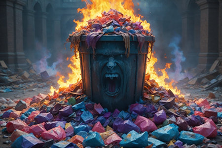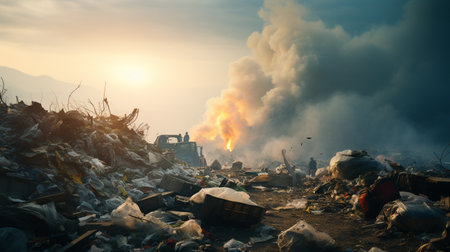 A dramatic scene depicting a fire erupting from a landfill site, surrounded by thick smoke and debris, showcasing environmental hazards and pollution.