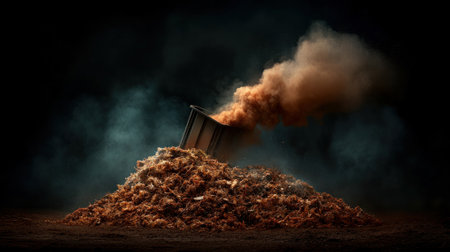 A dramatic scene of a tipped-over trash can spilling waste, surrounded by a cloud of smoke, highlighting pollution effects.