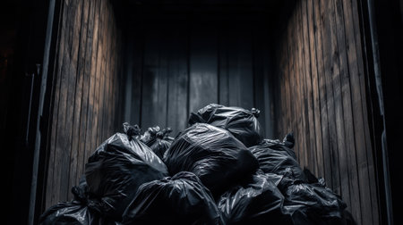 Dark and moody scene featuring pile of black garbage bags inside wooden container, creating sense of neglect and waste. lighting emphasizes texture of bags and wooden walls