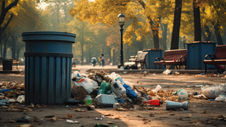 The trash can is filled with garbage and waste in the park. environmental pollution