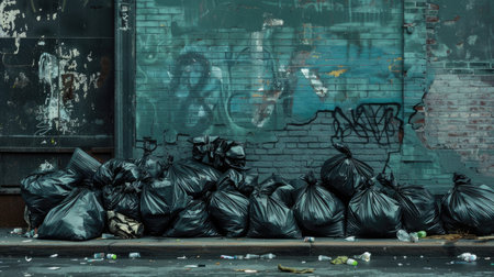 pile of trash bags surrounding an overfilled dumpster, created with generative ai