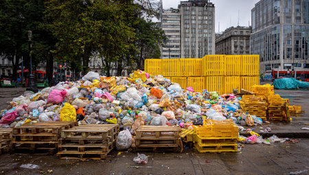 Numerous black trash bags and scattered litter are piled up on a city sidewalk, with urban life continuing in the background.