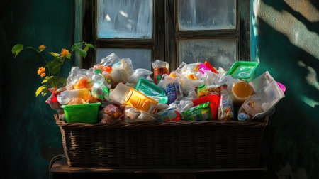 A vibrant indoor scene showcasing an overflowing basket filled with plastic waste. The contrasting rustic background and sunlight highlight environmental concerns.