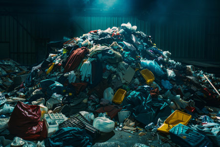 Large heap of discarded waste, including plastic, fabric and cardboard piled up in dark landfill. Pile of garbage, close up. Environmental pollution and overconsumption concept