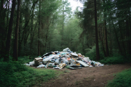 Fly tipping polluting a green forest with a pile of garbage, illustrating environmental damage and illegal waste disposal