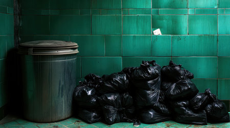 A stack of black garbage bags leans against a metallic trash can in a dimly lit green tiled room, highlighting urban waste challenges and the need for improved sanitation practices.