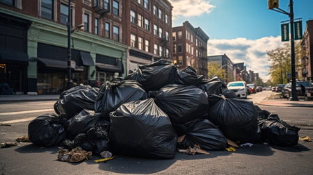full garbage bags lie along the middle of the city street. Environmental pollution