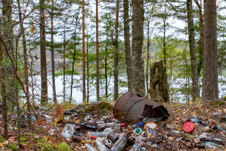 Illegal garbage dump in nature. Dirty garbage polluting the environment.