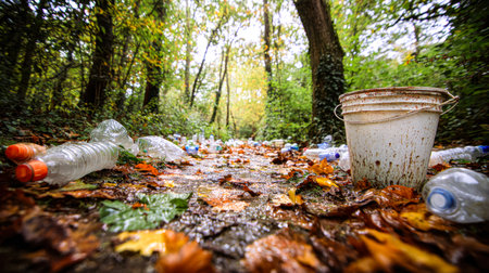 A quiet forest pathway cluttered with discarded plastic bottles and a weathered metal container, nestled among vibrant autumn leaves.