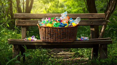 A woven basket filled with vibrant plastic bottles sits on a wooden bench in a serene park. The surrounding greenery highlights the pressing issue of littering and waste management in natural environments.