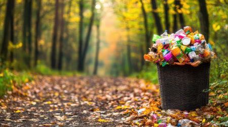 A striking scene showcases a basket brimming with vibrant plastic waste, placed along a serene forest path bathed in warm sunlight. The surrounding lush greenery emphasizes the need for environmental awareness and recycling efforts.