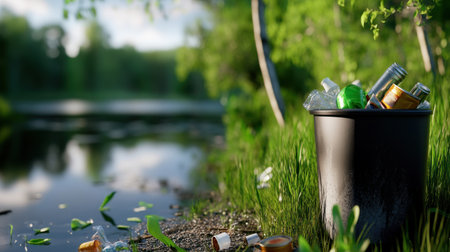 Overflowing bin in a nature reserve with plastic waste tangled in nearby grass and recyclable cans mixed in