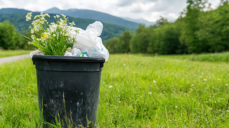 A striking image of a trash bin overflowing with waste, set against a backdrop of colorful flowers in a vibrant green field, highlighting environmental concerns.