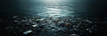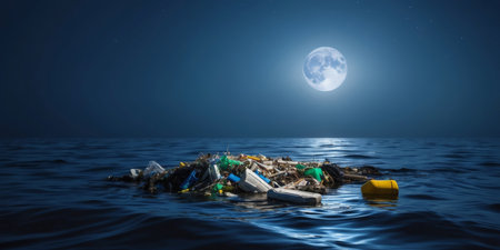 AI Generated. Trash floating in ocean under moonlit sky at night