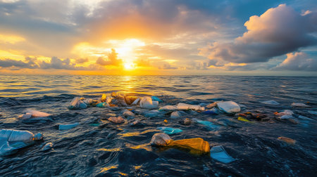 Vibrant sunset over the ocean reveals a stark contrast with pollution. Floating debris and trash are visible beneath the rippling water surface, illustrating environmental challenges