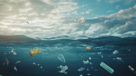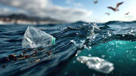 An evocative image showcasing plastic waste floating in ocean water, highlighting the impact of pollution on marine ecosystems and wildlife.