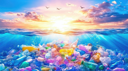 Sunlit plastic bottles float in the ocean, surrounded by debris and fish, highlighting environmental challenges