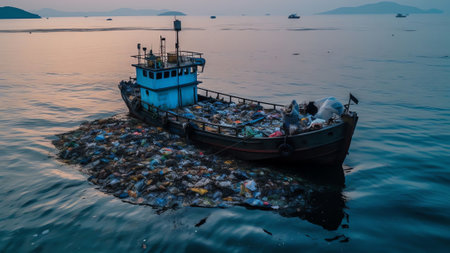 This striking image portrays a small boat amidst swirling pollution and debris in murky water, highlighting the urgent environmental issues we face today.