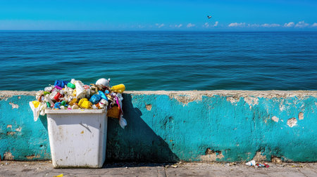 An overflowing trash bin filled with plastic waste sits on a coastal pathway, reflecting the stark contrast between human waste and nature