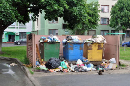 Luninets, Belarus - June 7, 2020: A container for collecting secondary material resources is overflowed with household waste. The container is littered with garbage. Ecological catastrophy.