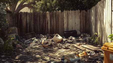 A collection of discarded doors, wooden frames, and garbage bags are stacked against a dilapidated building. Sunlight illuminates the scene, revealing overgrown grass and neglected surroundings