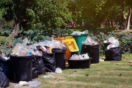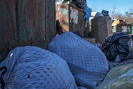 Huge garbage piles next to the dumpster after city fair. Stacks of litter bags overflow trash cans after festival in a city