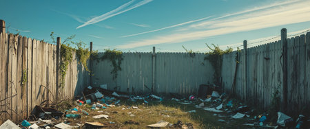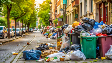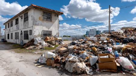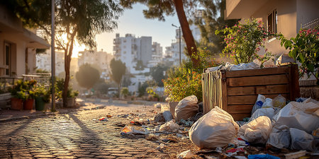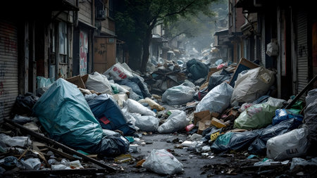 Cinematic depiction of a street overrun with trash and debris, highlighting urban decay and neglect