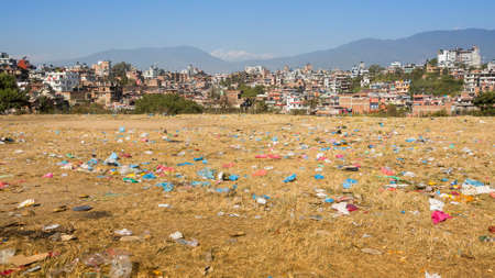 Debris on the field of view of panorama Kathmandu in the background. Environmental problems.