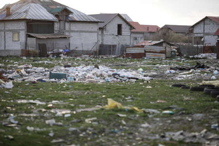 Bolintin, Romania - April 2, 2021: Piles of industrial and home waste lay on a field near inhabited houses.