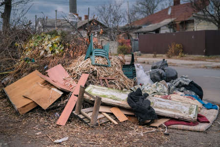 Zagreb, Croatia - 12 April, 2020 : Big pile of bulky waste and garbage next to the Mirosevecka street in Zagreb, Croatia.