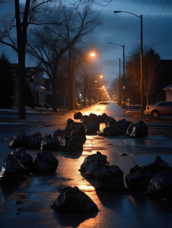 Twilight casts a golden hue over stacked refuse bags leaning against a city wall, with distant buildings and parked vehicles softly fading into the evening glow.