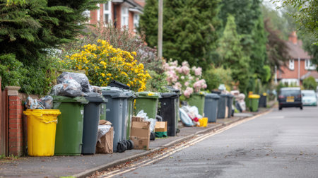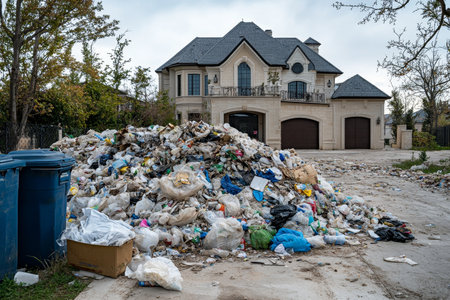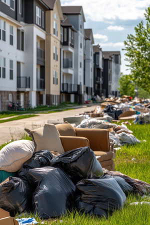 A cluttered street scene with overflowing waste bags and torn cardboard scattered beneath a gray, cloudy sky, with row houses lining the background in a somber urban