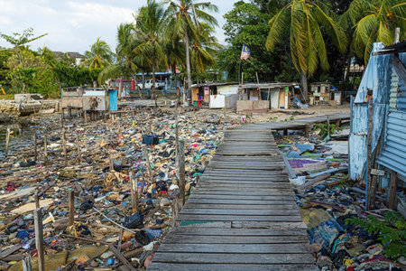 Fishing village houses over the water garbage poor areas in Sabah province in Malaysia