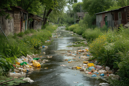A polluted natural area with illegally dumped waste, including plastic bags, trash, and debris, harming the environment and ecosystem