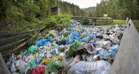 Ukraine, Bystrica, September 19, 2019: Mountains of Europe are threatened by mountains of civilizational debris brought by tourists and locals. The need for its recycling and disposal is obvious