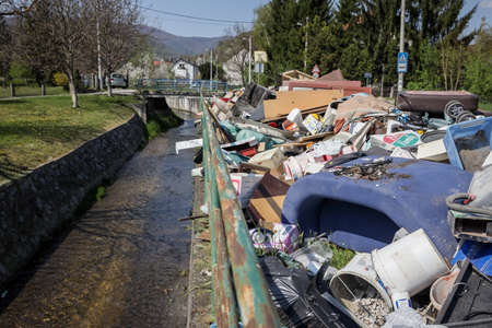 Zagreb, Croatia - 12 April, 2020 : Big pile of bulky waste and garbage next to the Mirosevecka street with streamlet in Zagreb, Croatia.