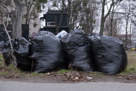 In a neglected urban park area, a cluster of black garbage bags accumulates beside trees, highlighting the ongoing challenges related to waste management in our communities and urban environments