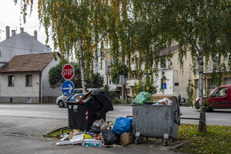 Belgrade, Serbia - November 17, 2022: Garbage pile beside dumpster scattered all over the street in Belgrade, Serbia