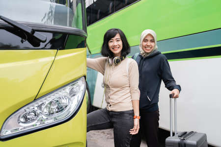 a woman with short hair and a woman in a headscarf smiled at the camera as she stepped into the bus door carrying bags and suitcases while going by bus