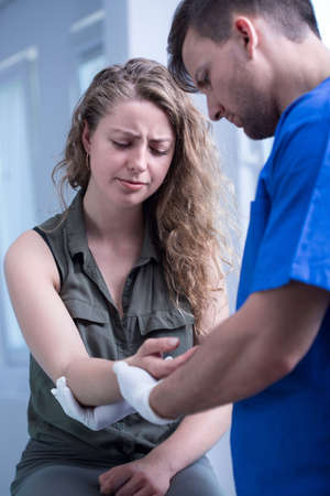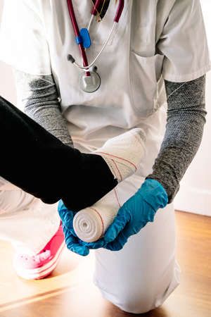 The traumatologist puts a bandage on the forearm of the female patient. The concept of help with fractures and sprains. The technique of applying a cruciform bandage.