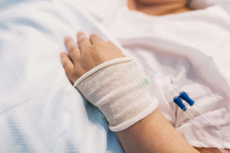 Patient hand syringe catheter closeup. Unknown man lying in hospital bed. Unrecognized person arm with syringe needle undergoing surgery anesthesia in clinic emergency room. Medical healthcare concept