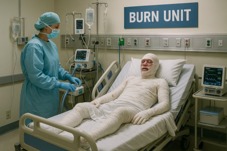 Healthcare professional caring for patient in burn unit hospital room with medical equipment. concept of medical care, healthcare worker, patient recovery.