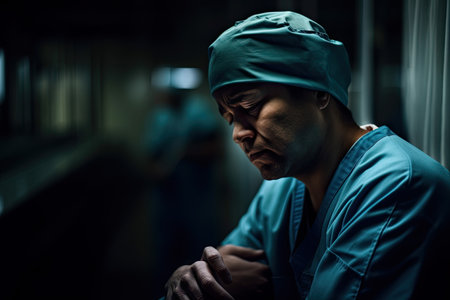 The image shows a black male doctor wearing a surgical cap and scrubs. He is looking at the camera with a serious expression. The background is dark and out of focus.