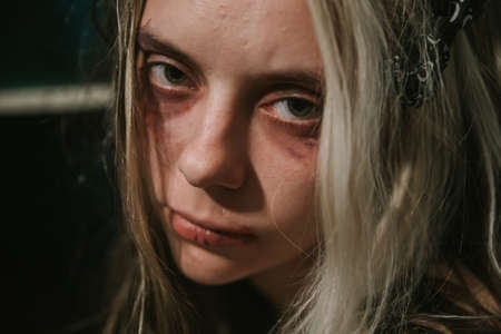 Frightened girl Bleeding face covered with bruises, touching her nose Close-up