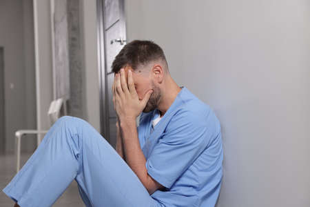 Tired medical worker after hard long surgery sitting on floor