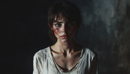 A resilient woman stands against a dark wall, displaying her bruises and strength in adversity