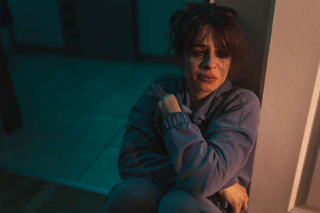 upset woman crying bruises under eyes depression dark background
